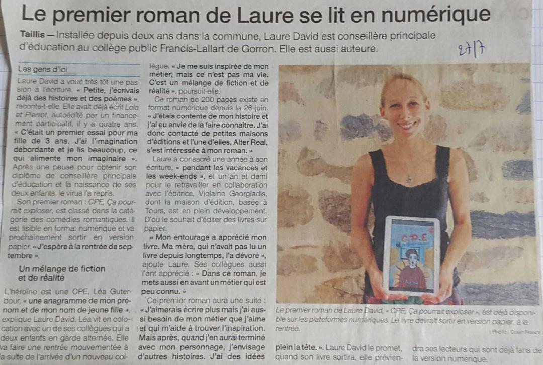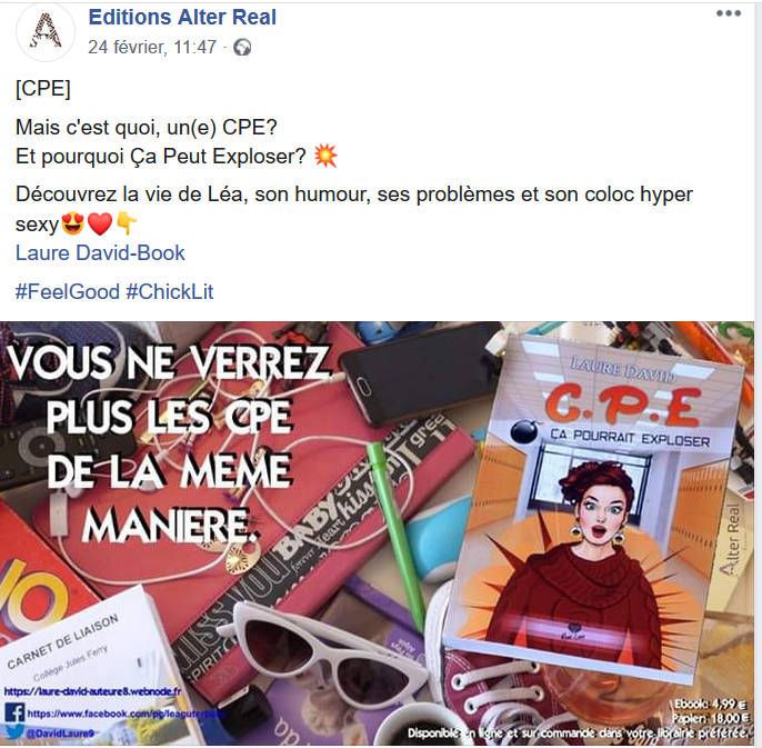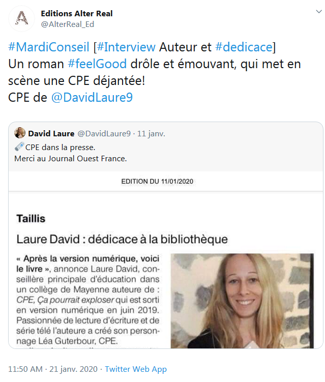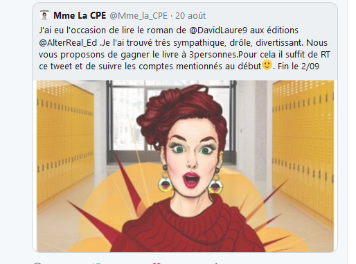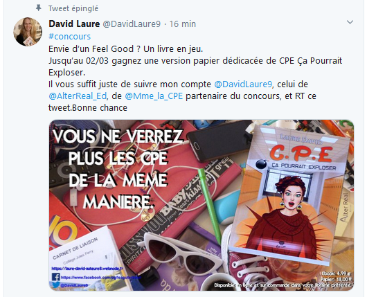 Une version papier dédicacée de CPE Ça Pourrait Exploser est à remporter sur Twitter. Vous pouvez participer du 22/02/2020 au 02/03/2020 en vous rendant sur mon compte Twitter @DavidLaure9. Les conditions sont simples: suivre mon compte, celui de la maison d'édition Alter Real, de Mme la CPE partenaire du concours et de retweeter l'annonce. Un tirage au sort aura lieu en présence de mes chassistants (aussi huissiers de justice, ne sont-ils pas formidables? ) lundi 02/03/2020 au soir et le résultat sera annoncé rapidement.