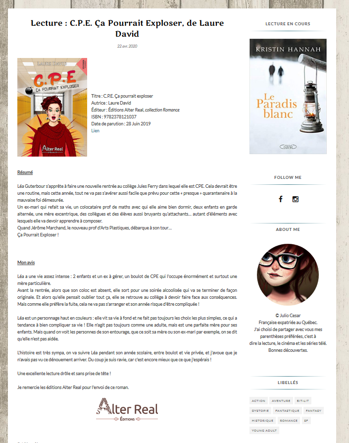 Merci beaucoup Les Lectures d'Angélique d'avoir réalisé une chronique au sujet de CPE Ça Pourrait Exploser. Je vous laisse la découvrir. Moi, je trouve que cela donne envie de lire CPE. Je dis ça, je dis rien...:)